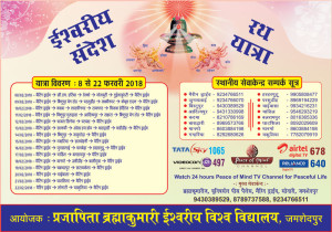 Jamshedpur mein 15 divasiya "Iswariya Sandesh Rath Yatra" Date: 8/2/18 se 22/2/18. For details contact: 9234766511, 9430389529